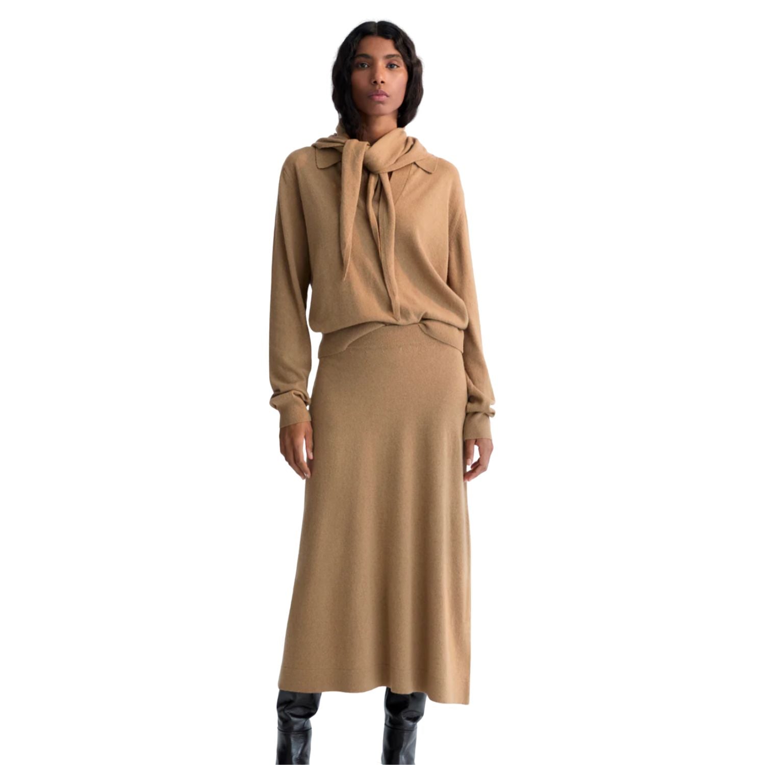 Crafted from a luxurious blend of cashmere and wool, this midi knit skirt features a flattering A-line shape and a comfortable elastic waistband. Soft, cozy, and effortlessly elegant for everyday wear.