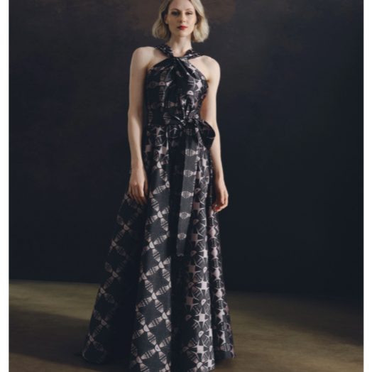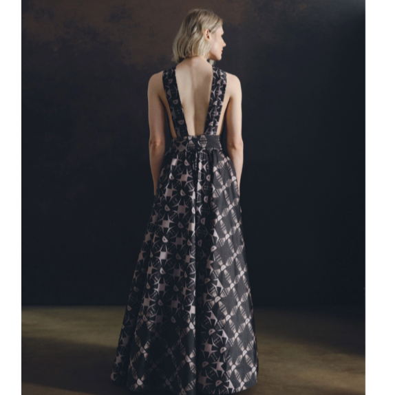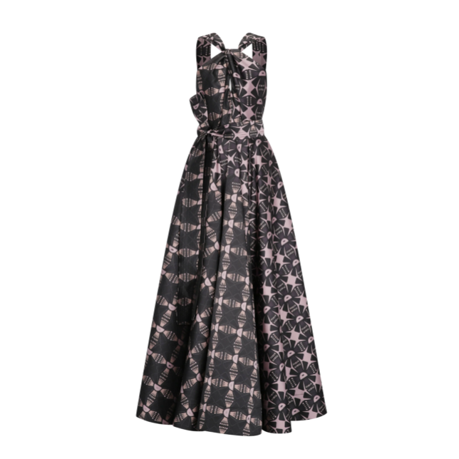 Maxi dress with a bust-shaping neckline and straps that can be worn crossed in front or halter style. Features an A-line skirt with a side slit, crafted in satin for extra gloss and fluidity. Includes a matching long tie belt. Showcased in our exclusive Mini Inti print in vibrant fuchsia.