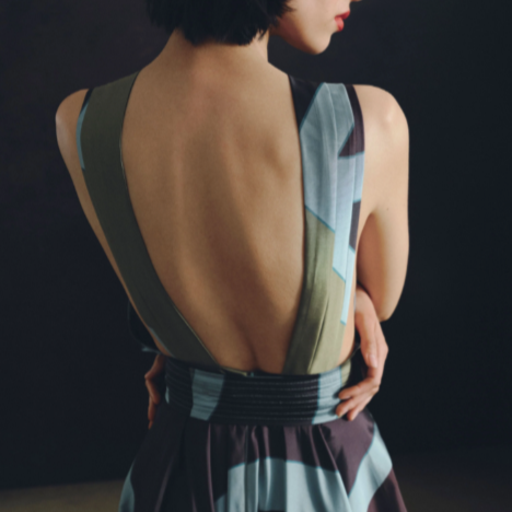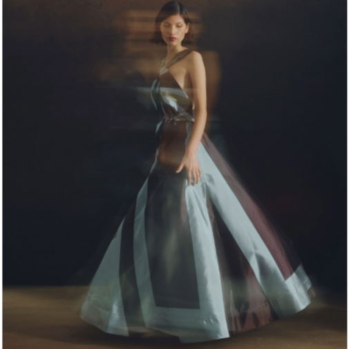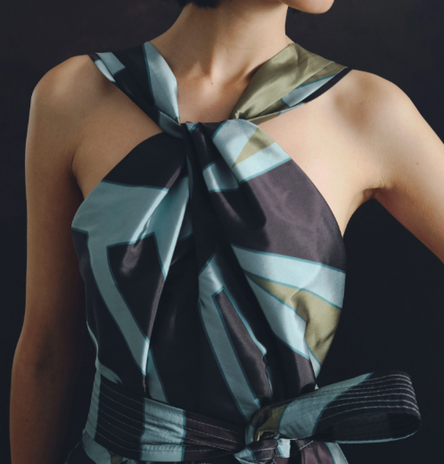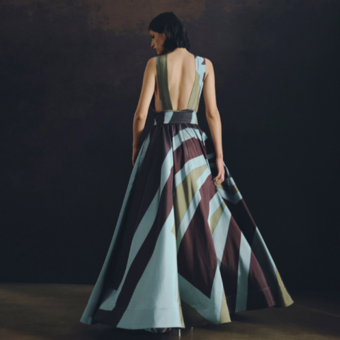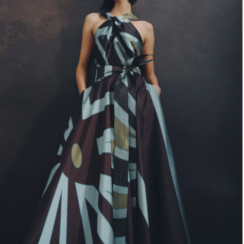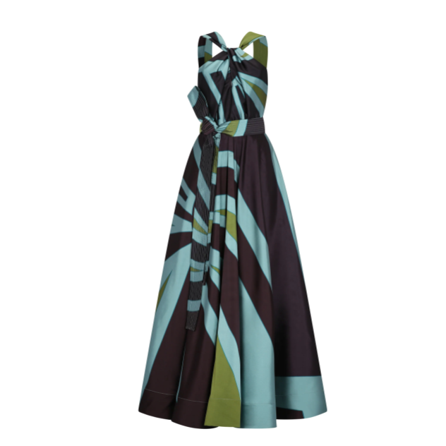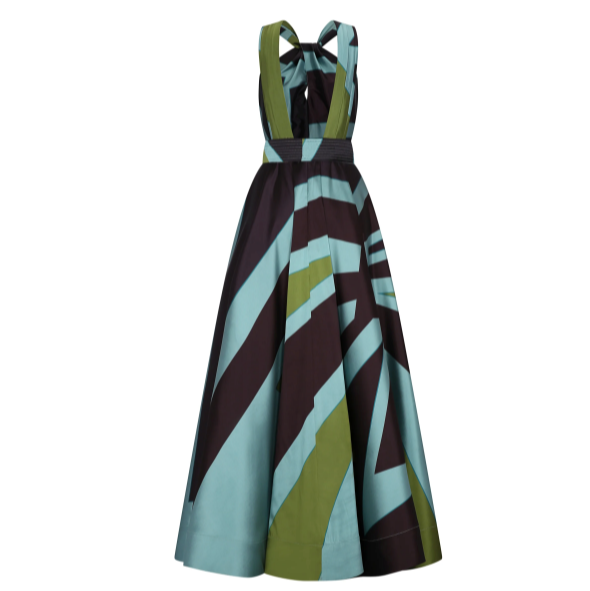 The Highlight of the Evening. A-line pleated maxi dress with chest eyelet and halter neckline that goes down the back as two parallel wide strings. With hidden pockets, waistband, and a front bow. In aqua taffeta with our Big Ray Point.