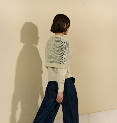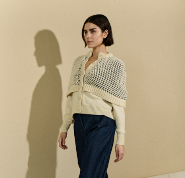 Round-neck fully fashioned jacket with long fitted sleeves, featuring an integrated bicolor bubble stitch cape. Fully fashioned piece combining gauges 5 and 3, made in Igualada. The yarn comes from Italy. Ribbed cuffs and hem. Front closure with matching buttons.