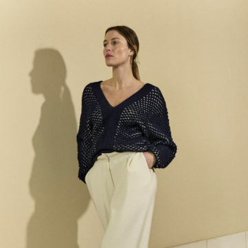 Bicolor bubble knit sweater, fully fashioned knitted on gauge 3. With a V-neck at the front and back, featuring a seam and central ribbing on the body. The sleeves are Japanese style, seamless. The cuffs and hem are ribbed. Made in Igualada. The yarn comes from Italy.