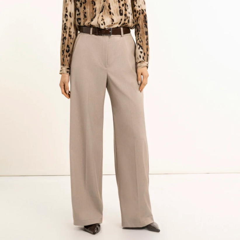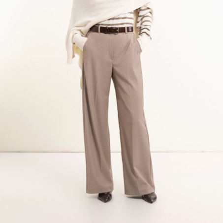 Wide-leg trousers with a regular waist, front slant pockets, and an elastic waistband at the back. They feature a central crease and a straight, flowing leg.