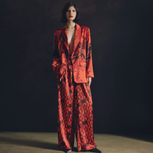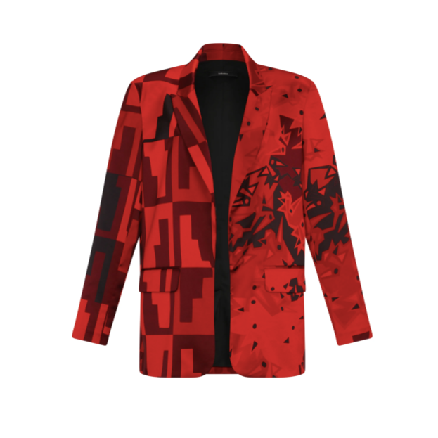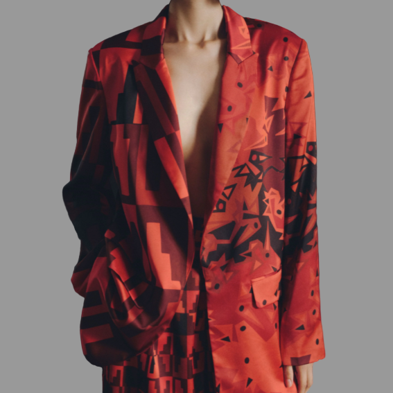 The New Classic. Flowy Satin Blazer With a Masculine Fit, Showcasing a Striking Mix of Our Maxi Andean Steps and Maxi Pelican Prints in Vibrant Orange.