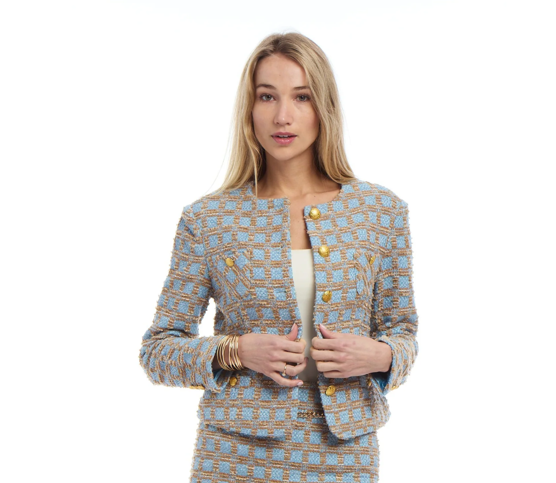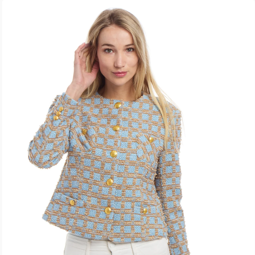 Imported fabric from France. Soft check in stunning jacket with gold buttons. Fully lined.