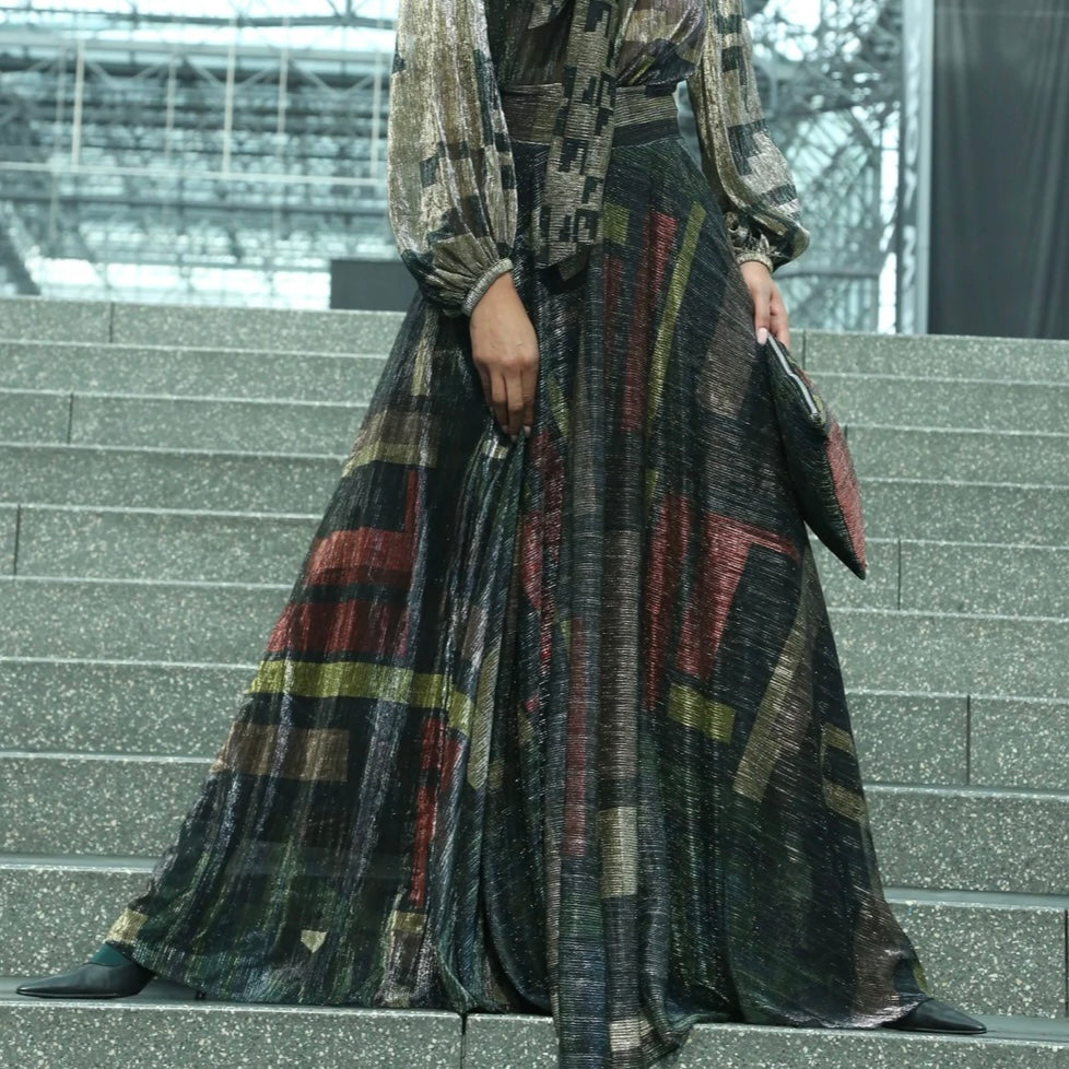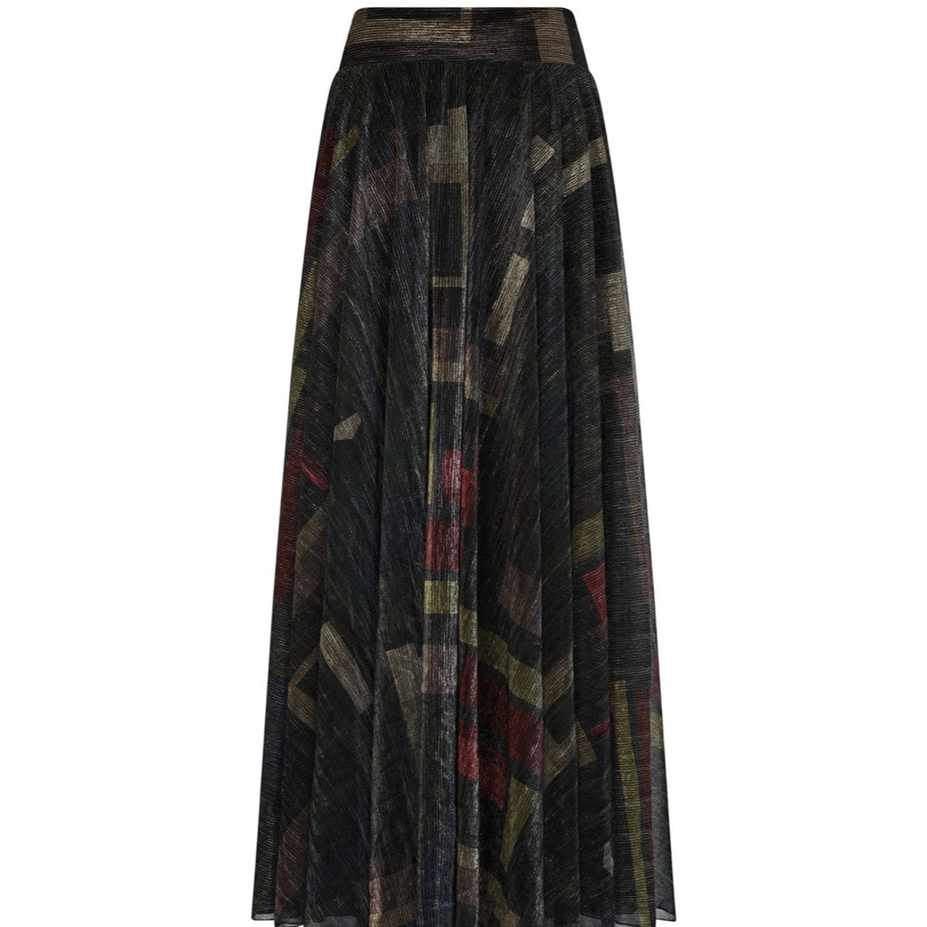 THE ESFERA SKIRT IS A STATEMENT PIECE CRAFTED IN SHEER METALLIC TULLE, FEATURING AN A-LINE SILHOUETTE WITH SHARP PLEATS AND A BOLD, FLOWING SHAPE. DESIGNED IN OUR EXCLUSIVE HUARIHAUS PRINT, IT BLENDS ABSTRACT SHAPES WITH SUBTLE SHIMMER FOR A LOOK THAT IS BOTH BOLD AND VERSATILE. WEAR IT AS A SET WITH THE ESFERA BLOUSE OR STYLE IT SOLO TO KEEP THE FOCUS ON THE PRINT.