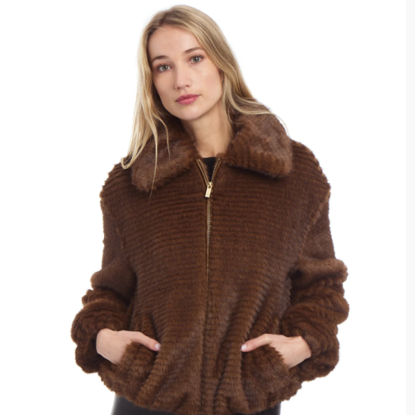 Garbo Bomber. Chic zipper front Faux Mink fur with stretch sleeve opening. Fully lined