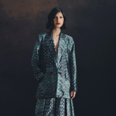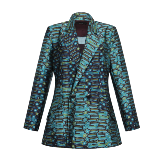 Statement Piece. Structured A-Line Jacket With a Crossed Two-Button Front, Wide Lapel, and Hidden Pockets. Crafted in Our Aqua Fish Print on Taffeta, With a Satin Lining for a Touch of Luxury.