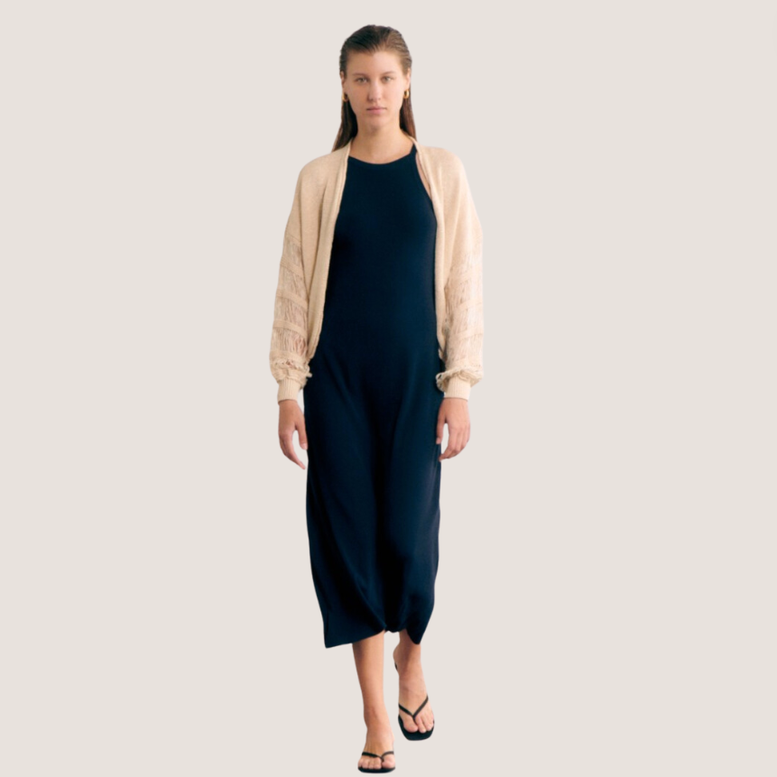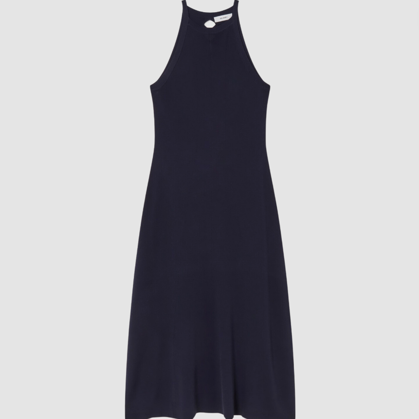 Navy fully-fashioned full needle midi dress. Halter neckline and tight fitting in the body and loose-fitting in the skirt. It has a line of geometric openwork on the back.