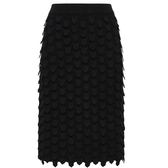 A new idea of elegance takes shape in this longuette skirt, where the three-dimensional “fish” stitch gives rhythm and depth to the garment. Each tip, intarsia and hand-sewn, draws a lively and vibrant pattern, for a look that tells the art of detail according to Malìparmi.