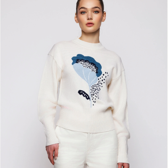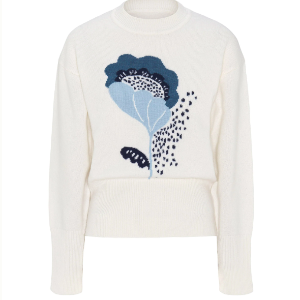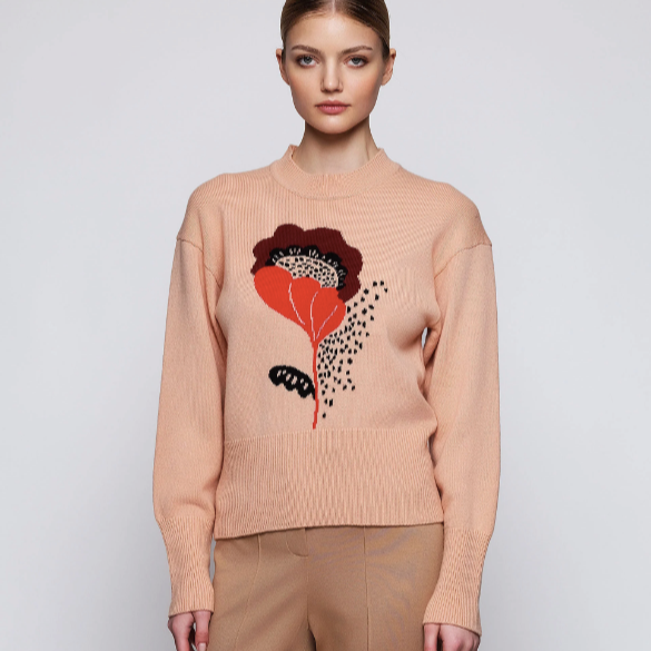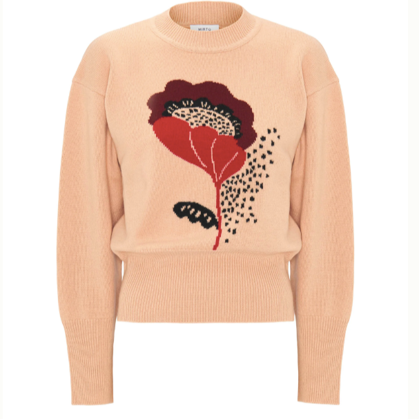 Short jumper in jacquard wool & cashmere blend with floral motifs. Square neckline & long sleeves. A trending cropped jumper. The floral motif makes it the ideal choice for adding warmth and versatile style to your looks.