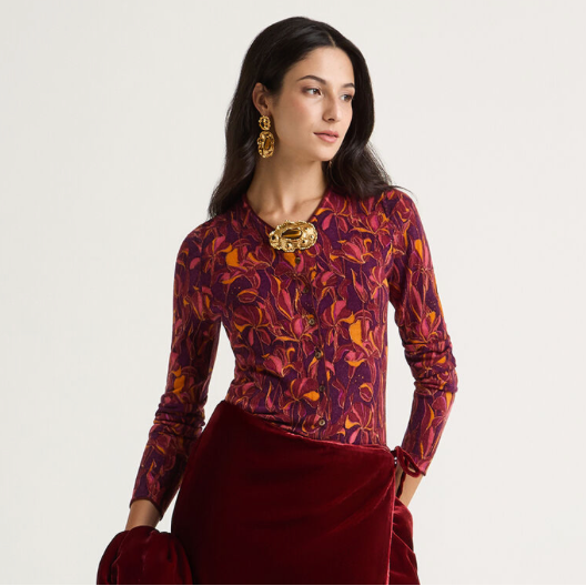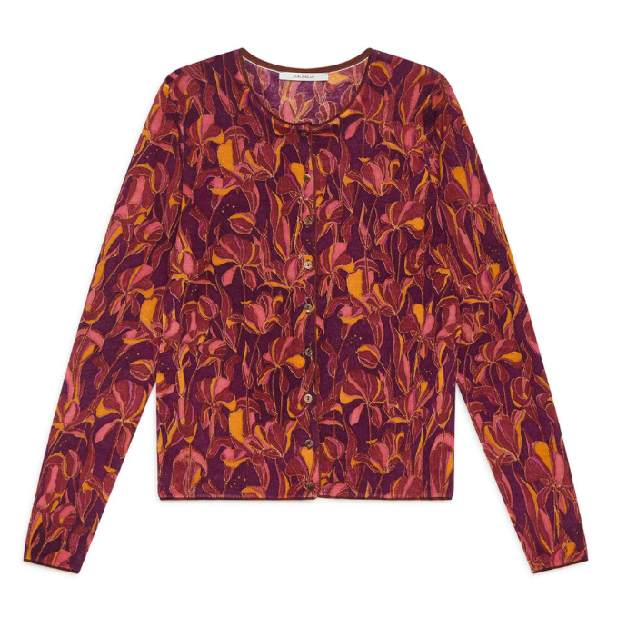 This extrafine merino wool crewneck cardigan features a vibrant geometric pattern in electric blue and white tones. Warm yet light, it fits perfectly for any time of day with a bold graphic twist. A piece that balances comfort and modernity.