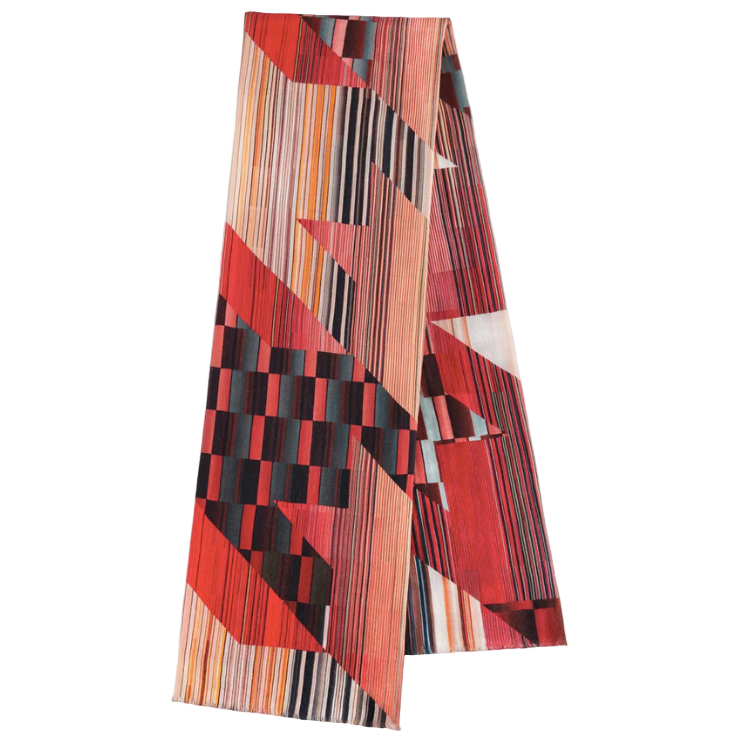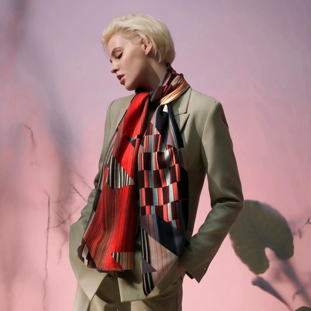 The bright red colour penetrates through the classic houndstooth print, as if a flock of birds are flying through the sunset, stirring up the peaceful afternoon. The intertwined fine lines at the back add calmness in the storm, creating a pattern that is bold, yet sophisticated.