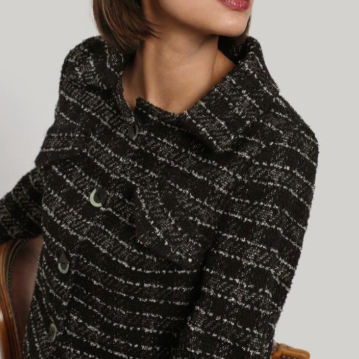 Short tailored jacket with a straight collar with flap and faux pockets in a French tweed made of wool, polyester and Lurex®.