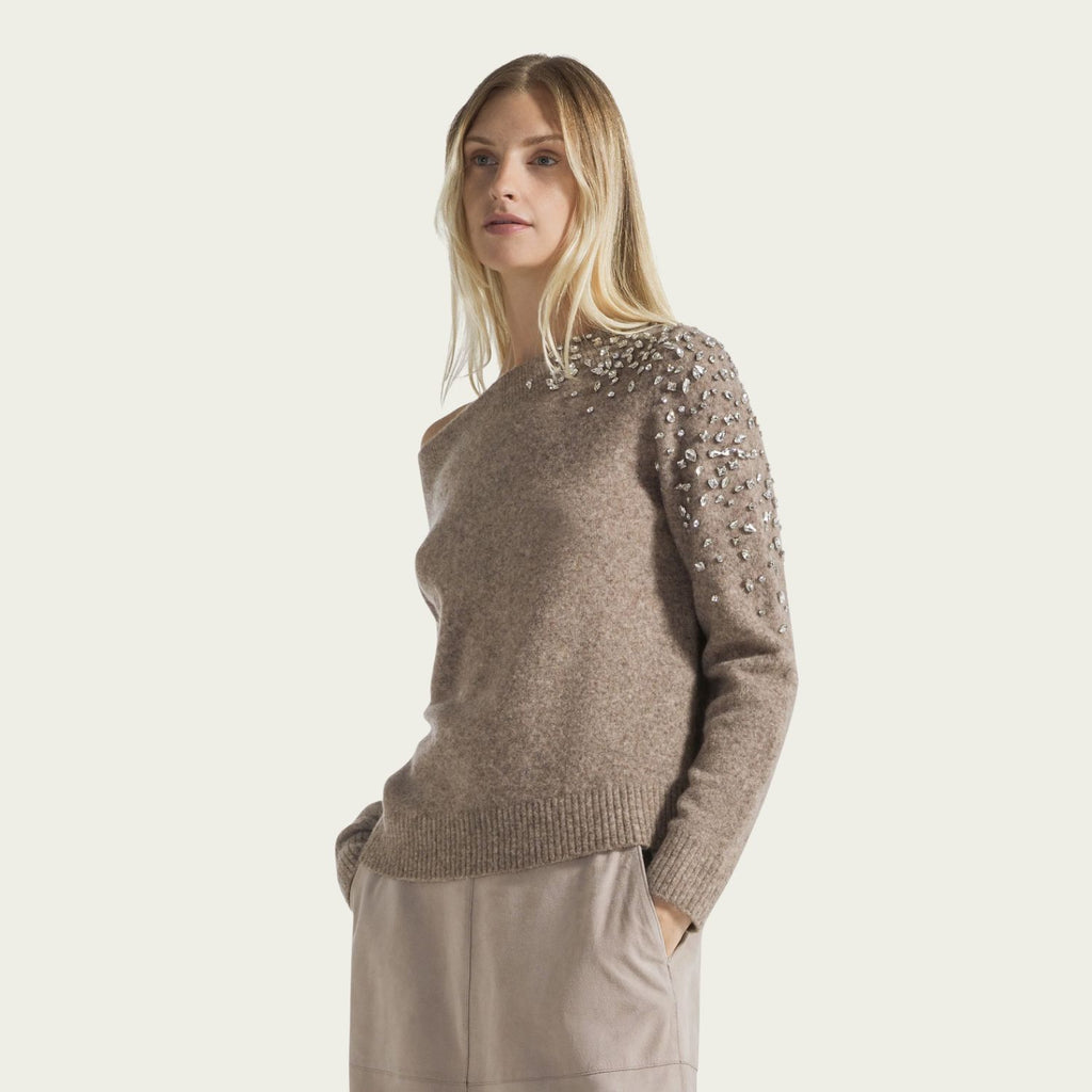Stretch wool and baby alpaca bateau neckline sweater with hand-applied rhinestone jewel embroidery.