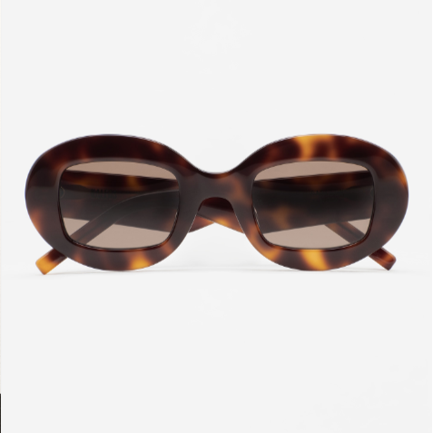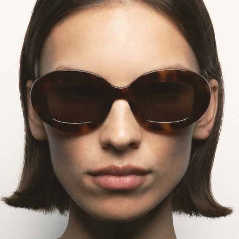 Pantos-shaped sunglasses with a flat brow and milling around the lenses. Amber acetate frame front and temples. Mineral green lenses, base 2, with 100% UV protection and anti-reflective treatment. Category 3 lenses. Built-in acetate nose pads. Handmade.